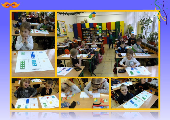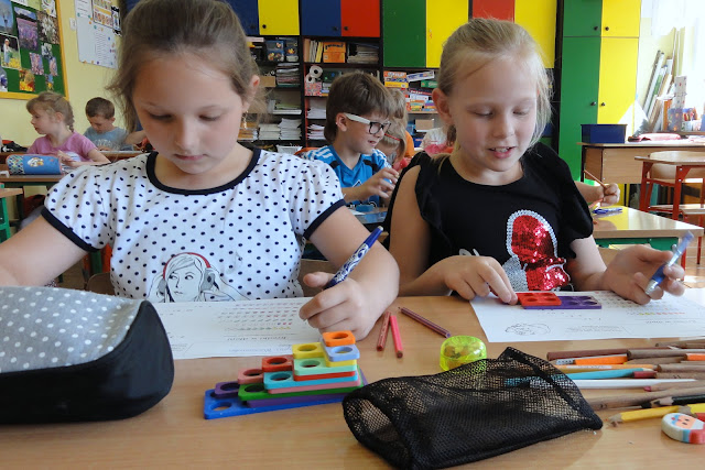 1. Ile - bez przeliczania. Uczniowie ustalają ilość różnych elementów na planszy bez przeliczania ich. Na każdym przedmiocie kładą kołeczek. Następnie kołeczki układają we wzór kształtu Numicon na podkładce i sprawdzają dopasowując odpowiedni kształt. Uzupełniają kartę zadań.