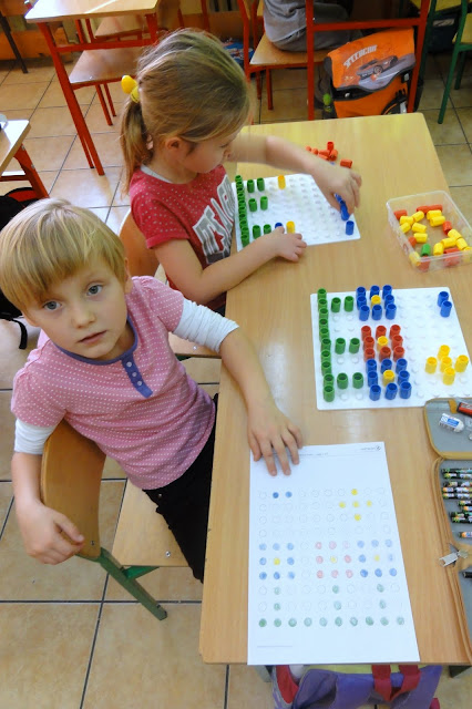 Dzisiaj uczniowie klasy 1b układali wzory z "kołeczków" Numicon i odwzorowywali swoje obrazki na specjalnych kartach, będących dokładnym odwzorowaniem plansz (dostępne na stronie producenta).